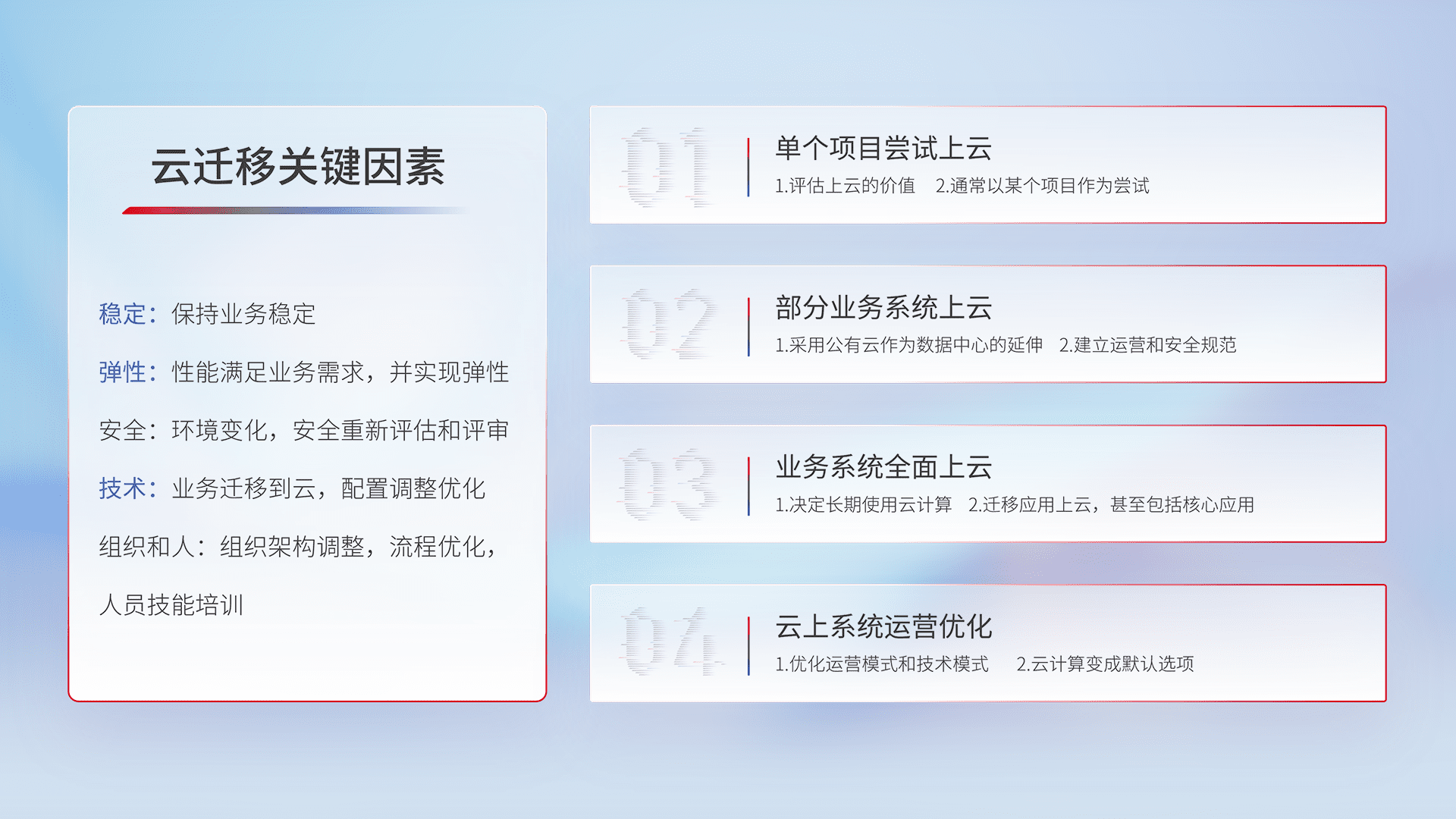 结合实际业务,,,从规划设计、、云平台选型、、、云原生改造、、数据迁移、、、、集成交付,,,,迁移全过程为客户识别最佳上云路径,,做好风险识别管理,,,,设计网络架构、、身份权限、、、、安全审计合规、、、操作审计、、、日志审计、、、监控告警策略、、、、多站点容灾设计等,,,,对云上基础设施进行整体规划,,提升IT治理水平,,,以满足弹性、、、高可用、、、高性能的需求。。。。