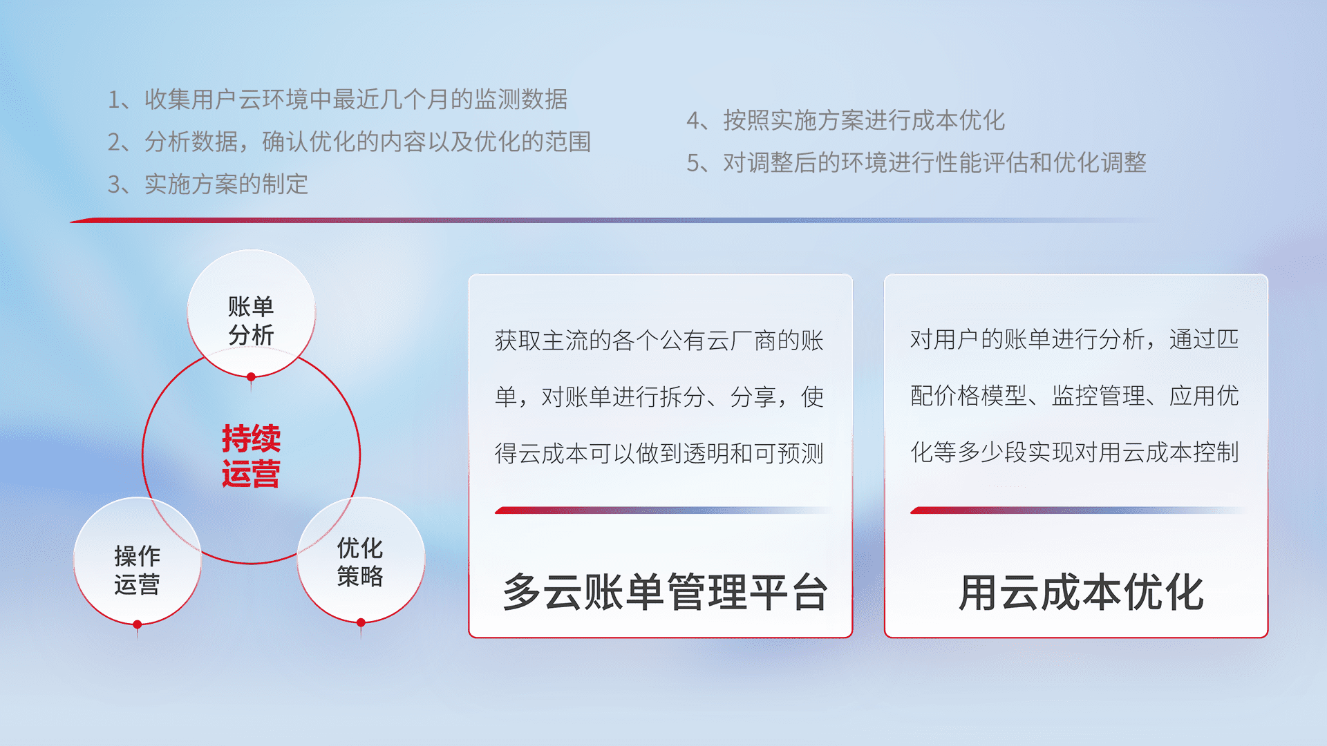 通过多云纳管,,,,以统一的资源数据模型把客户的云资源进行抽象和封装,,,,进而实现对多云资源的统一操作,,,保障云资源管理的可靠性、、、稳定性与可用性。。。量身定制化运维内容,,,,配置、、、、开发运维、、、补丁管理、、、、备份、、、、监控、、、认证和访问管理、、、、审计和日常巡检等,,,保障在用云过程中的可靠度,,稳定度以及高可用率。。。。