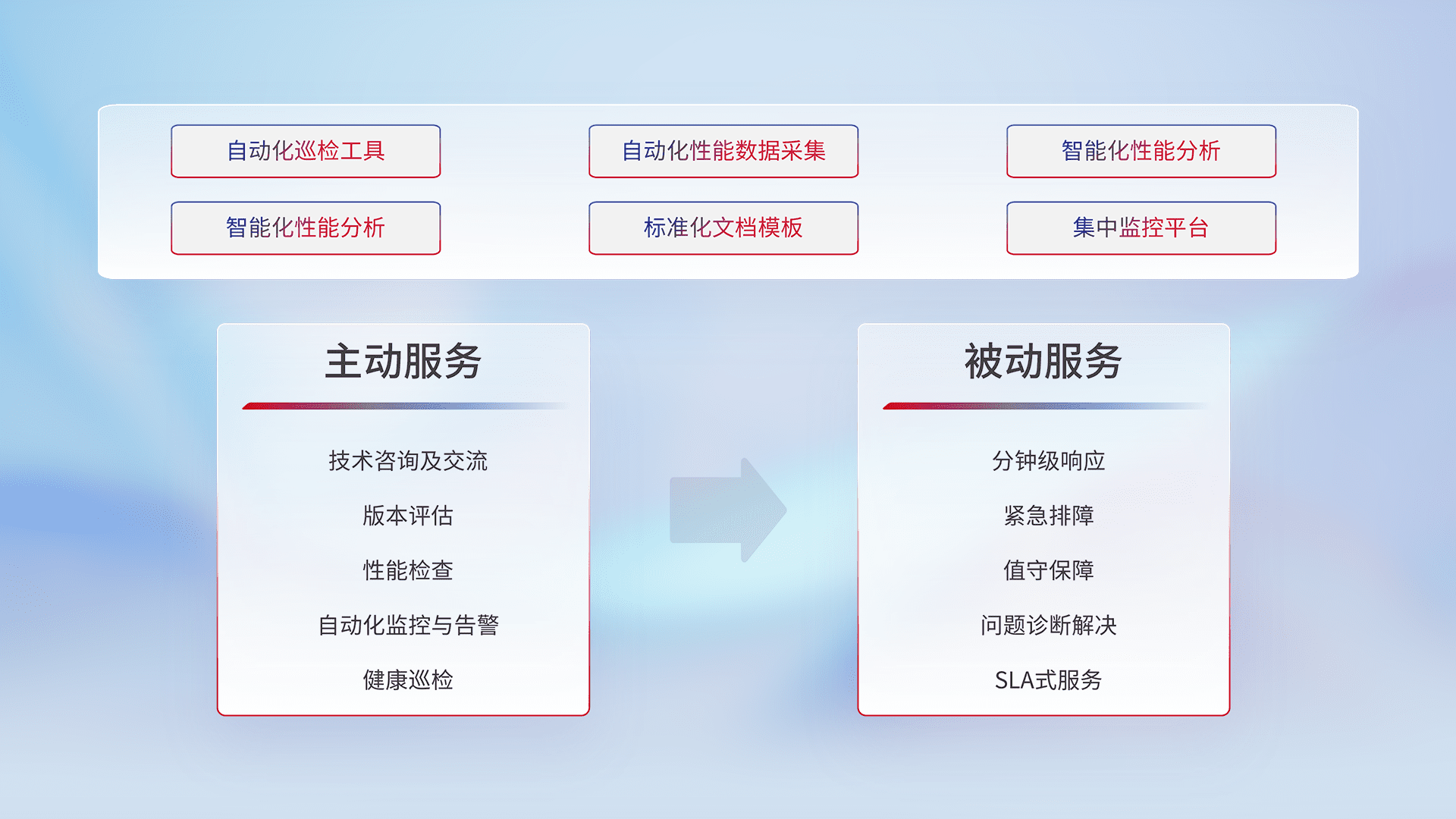 智能化工具和标准化文档,,保障服务质量,,,,提供主动服务(包含技术咨询、、、、版本评估、、、、性能检查、、、自动化监控与告警、、、、健康巡检)和被动服务包含(分钟级响应、、、紧急排障、、、值守保障、、问题诊断解决、、SLA服务)。。。