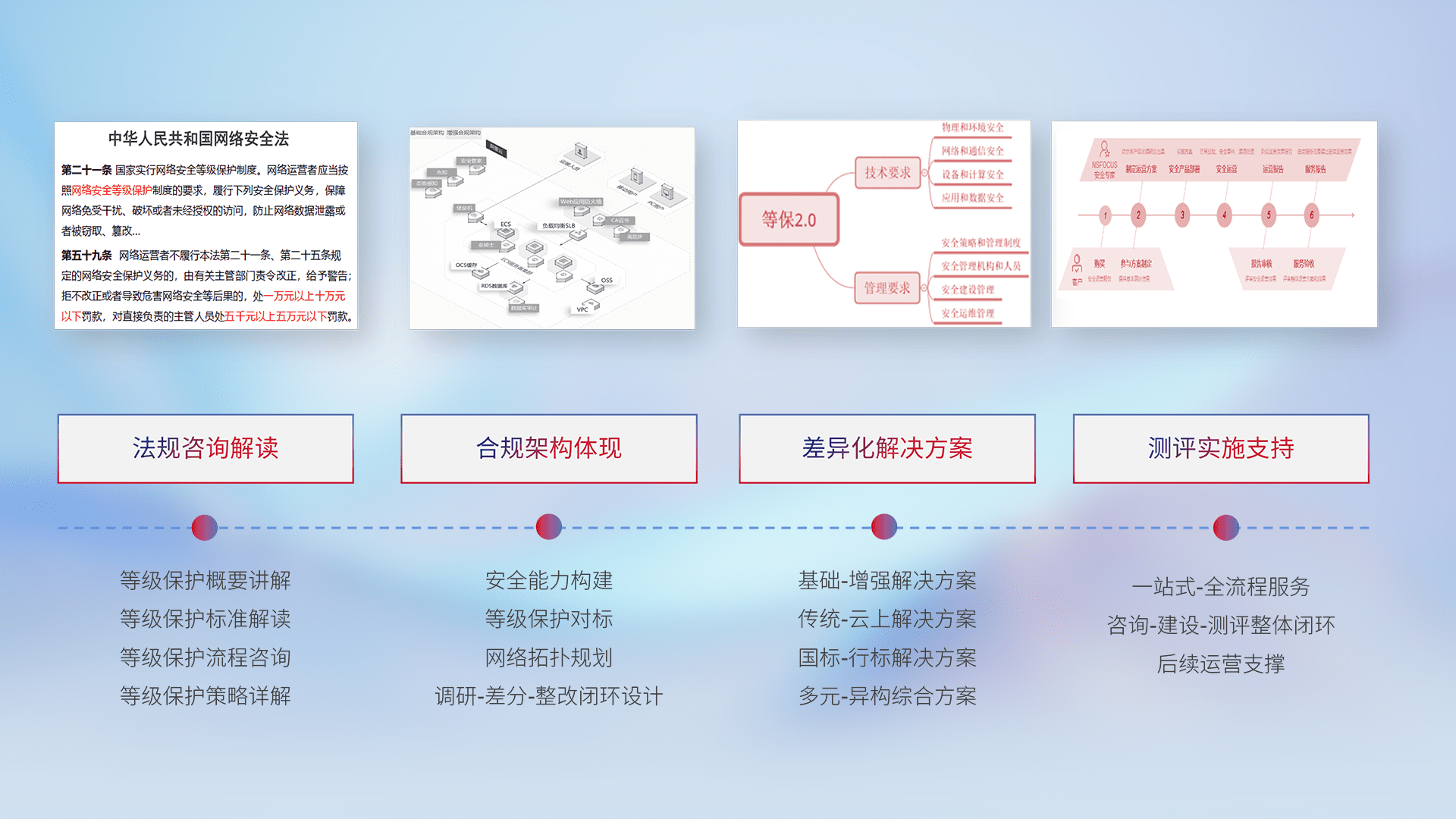 通过专业的法律咨询解读、、、、合规架构体现、、差异化解决方案、、、测试实施支持等服务,,,为客户量身打造等保合规体系。。。